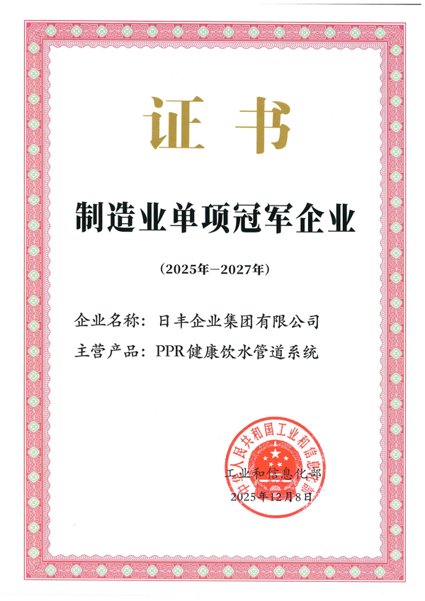 日丰企业集团始终坚守立业初心,发挥龙头引领作用,多维推动行业变革升级。在产品方面,前瞻洞察市场需求,在上世纪九十年代,率先引进欧洲先进技术与设备,开拓兼具塑料与金属双重优势的铝塑复合管领域,彻底改变国内长期使用镀锌水管的局面。至2008年,日丰企业集团成为全球最大的铝塑管生产商。在此时期,公司再度领先行业趋势,推出新型管道PP-R管,开创了塑料管道的新时代。目前,日丰企业集团已设立八大现代化生产基地,全面覆盖华南、华北、华中、西北、东北等市场,总占地面积超3000亩,拥有超380条生产线,以卓越的智能制造与交付能力,筑牢品质与供应链的坚实根基;在研发方面,持续投入数十亿元,拥有CNAS国家级认证实验室、国家级企业技术中心及广东省工程技术研究开发中心等多个省部级科研平台,累计荣获1000余项国内外专利,通过140余项国际认证(含美国NSF、欧盟CE、德国DVGW、西班牙AENOR、荷兰KIWA五大国际权威认证),主导及参与110余项国家及行业标准制定,以技术创新助推行业高质量发展。在服务方面,秉承“客户第一”准则,行业首批推出免费试水试压服务,升级“日丰安全卫士”产品+服务新模式,提供五十年双质保服务承诺,为行业打造服务标杆。2025年,日丰企业集团获第三方权威机构沙利文认证,上年度家装管道销量、销额、服务家庭数与营销网点数量四项均居行业第一,成为家装管道领域“行业冠军”。