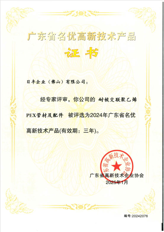 广东省名优高新技术产品-耐候交联聚乙烯PEX管材及配件