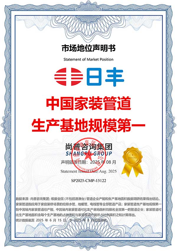 目前,日丰已经形成完整的产品体系。其中,日丰管是集团旗下生产的管道产品的集合,包括PP-R管、地暖管、中央配水系统、pvc排水管道系统和pvc穿线管道系统等,并与相应的构件组合为专业的系统。