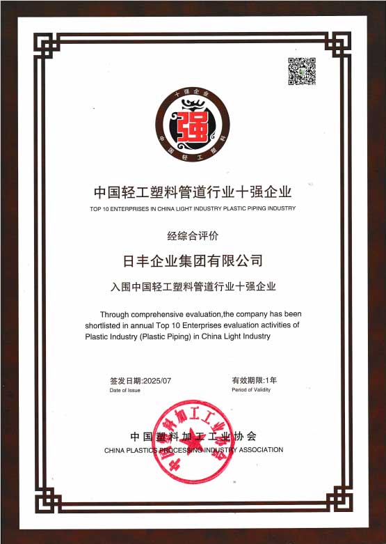 日丰企业集团有限公司是中国新型塑料管道研发生产与推广应用的知名企业,中国给水管道升级、变革的重要推动者,是中国塑料加工工业协会塑料管道专业委员会副理事长单位,国家火炬计划重点高新技术企业,同时也是管道与卫浴全面发展的大型建材产业集团。
