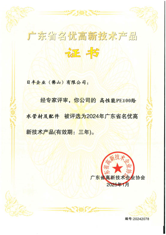 广东省名优高新技术产品-高性能PE100给水管材及配件
