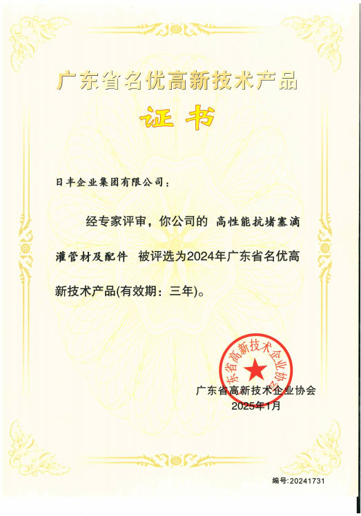 广东省名优高新技术产品-高性能抗堵塞滴灌管材及配件