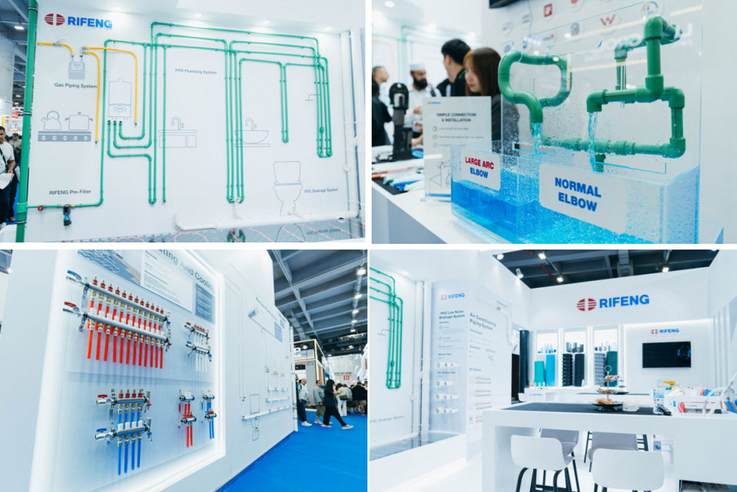 打破传统陈列模式,日丰以场景化管道排列为核心打造展位,将PP-R供水系统、PAP燃气系统、PVC排水管道等明星产品融入实际应用场景。特别增设的“流量对比装置”直观呈现大弧度弯管件的优势!