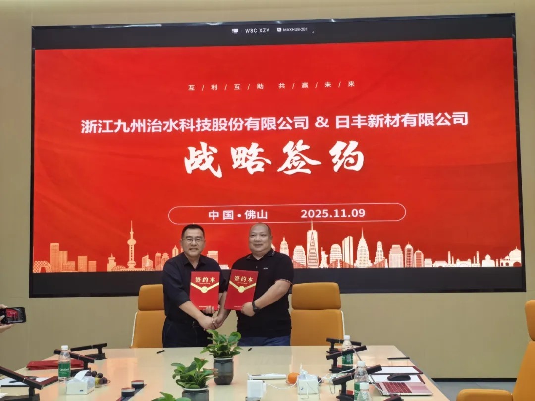 考察结束后,日丰新材有限公司与浙江九州治水科技股份有限公司举行战略签约仪式。此次合作可谓强强联合,未来双方将实现优势互补、资源共享,聚焦水资源管理、水利人才培养、高标准农田建设等关键领域,携手共建“研发-生产-市场”全链条合作体系。