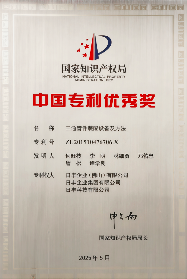 近日,第十四届中国国际专利技术与产品交易会开幕式暨第二十五届中国专利奖颁奖大会在大连国际会议中心隆重召开。本届大会以“专利转化运用赋能创新发展”为主题,由国家知识产权局主办、大连市人民政府承办,旨在推动专利技术成果转化,助力新质生产力发展,吸引了全球知识产权领域专家学者、企业代表及国际组织参与。日丰企业集团有限公司(以下简称“日丰”)凭借专利“三通管件装配设备及方法”,斩获“中国专利优秀奖”(专利号:ZL201510476706.X),这一殊荣不仅是对日丰在管道装备核心技术领域创新突破的高度认可,更是日丰践行专利转化运用、以硬核技术赋能产业高质量发展的有力印证。
