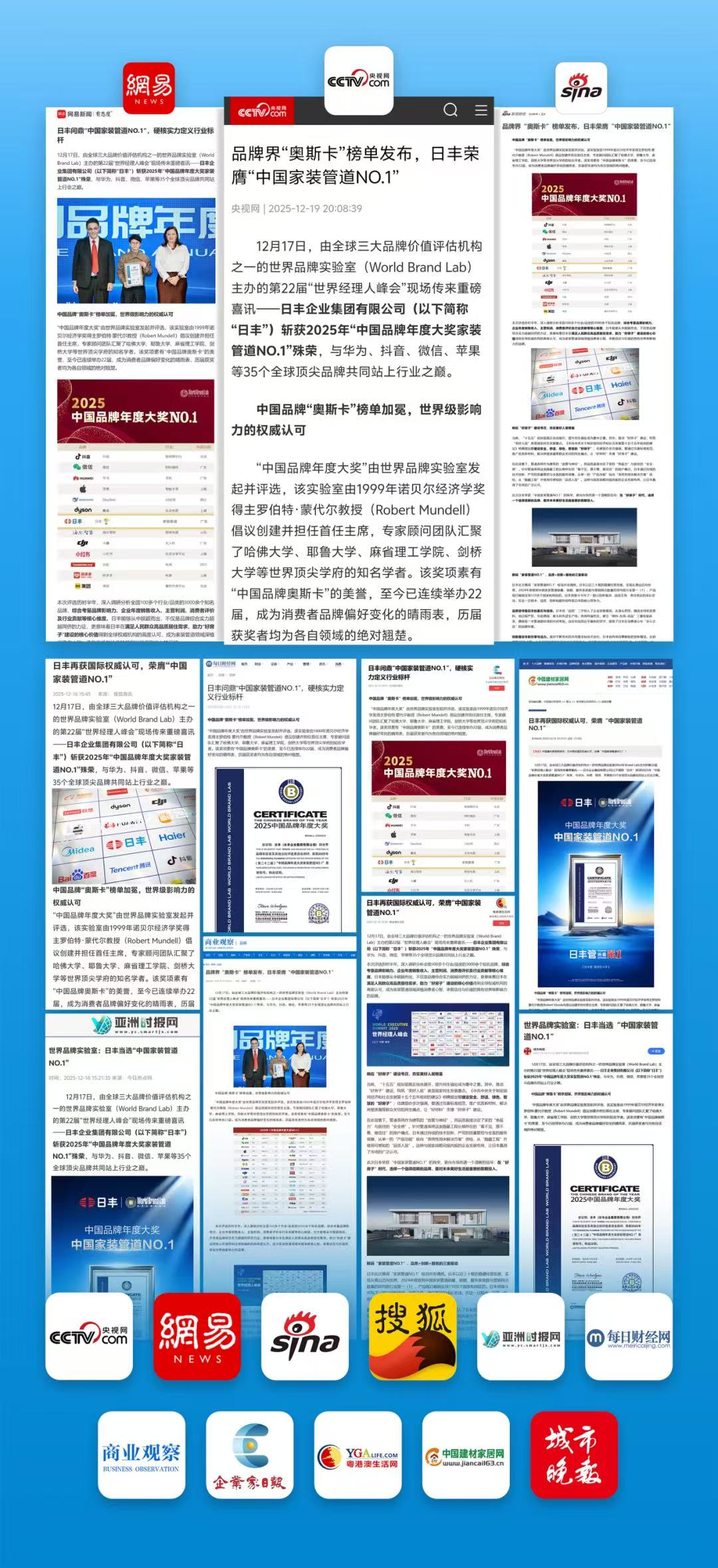 12月17日,由全球三大品牌价值评估机构之一的世界品牌实验室(World Brand Lab)主办的第22届“世界经理人峰会”现场传来重磅喜讯——日丰企业集团有限公司(以下简称“日丰”)斩获2025年“中国品牌年度大奖家装管道NO.1”殊荣,与华为、抖音、微信、苹果等35个全球顶尖品牌共同站上行业之巅。