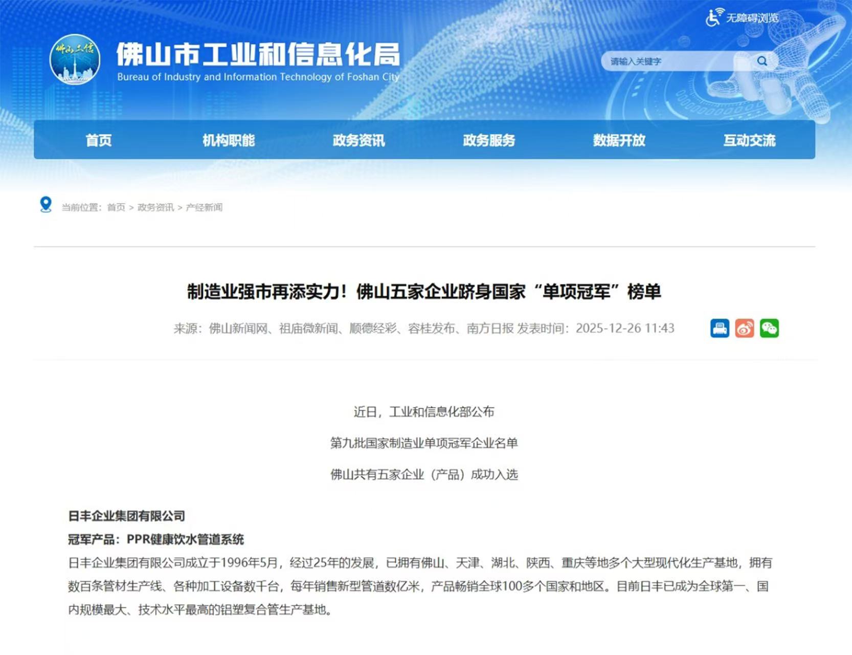 近日,工业和信息化部正式公布第九批国家级制造业单项冠军企业名单,日丰企业集团有限公司(以下简称“日丰”)凭借PP-R健康饮水管道系统,斩获“国家级制造业单项冠军企业”殊荣。这一权威认可不仅印证了日丰在细分领域的深耕精度与核心竞争力,更是对日丰在推动住宅品质升级、助力国家“好房子”建设中所贡献的专业力量的深度肯定。